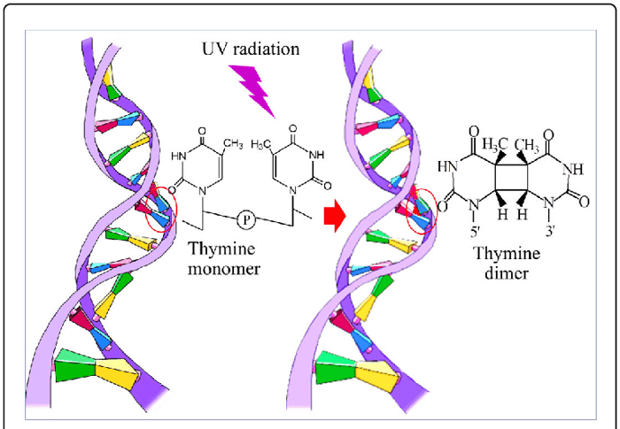 This energy causes photochemical reactions—most importantly the formation of pyrimidine dimers(such as thymine dimers in DNA or uracil dimers in RNA). These lesions distort the genetic structure and block transcription and replication.