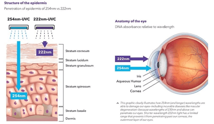 'Compared with 254-nm UVC, 222-nm UVC not only exhibits comparable or potentially superior efficacy in disinfecting diverse micro-organisms but also causes less DNA damage to the mammalian cells.'